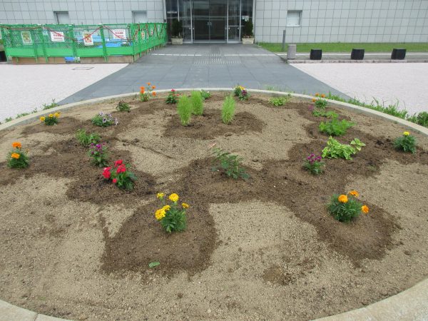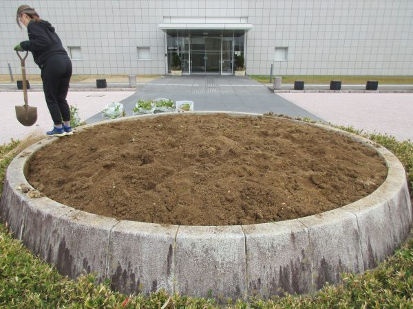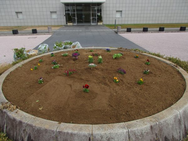 整地後に、冬の寒さに強い花苗を植え付けました。