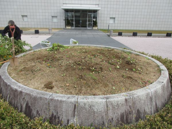 先日、サブエントランス前花壇の冬支度をしました。
